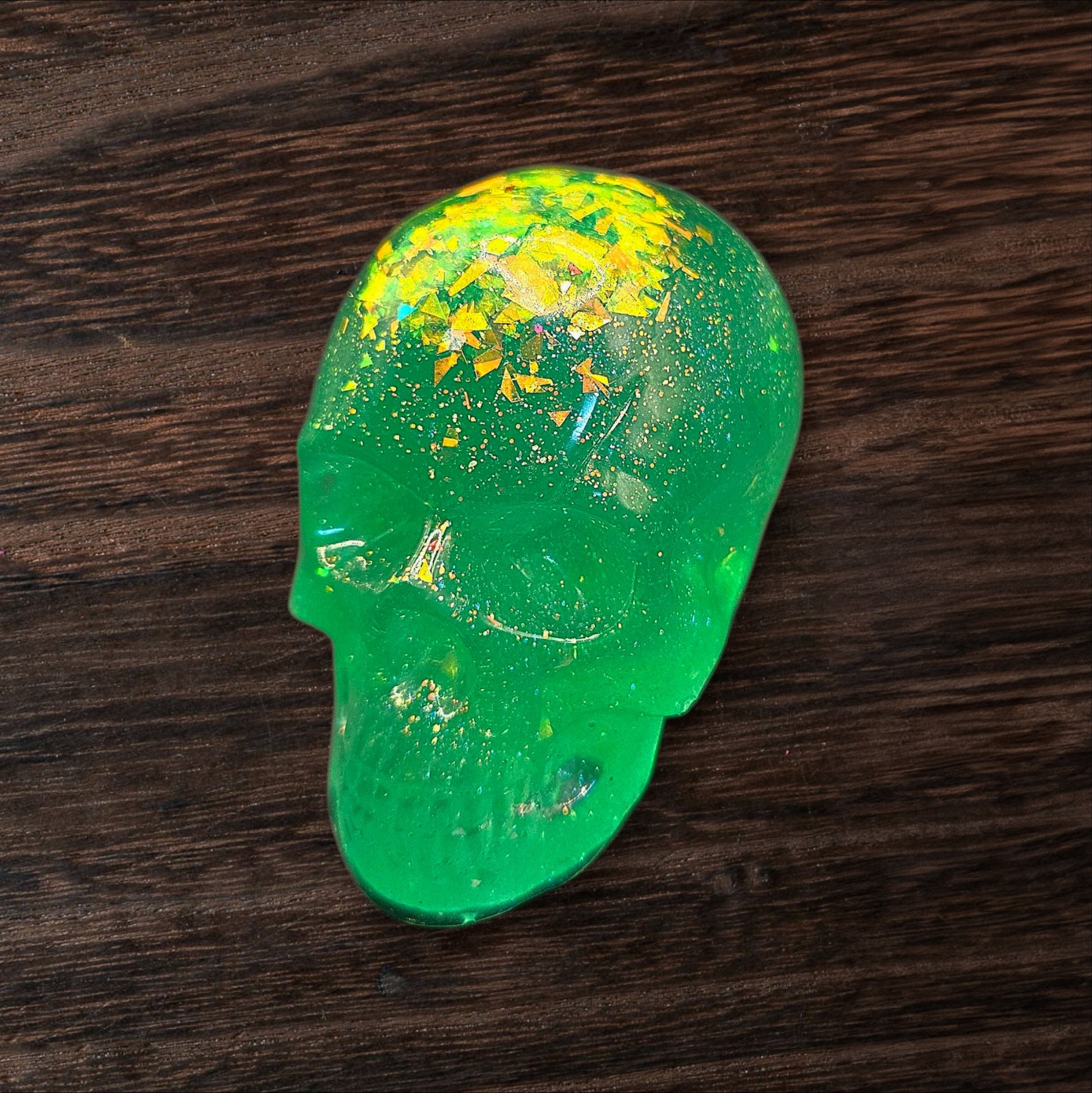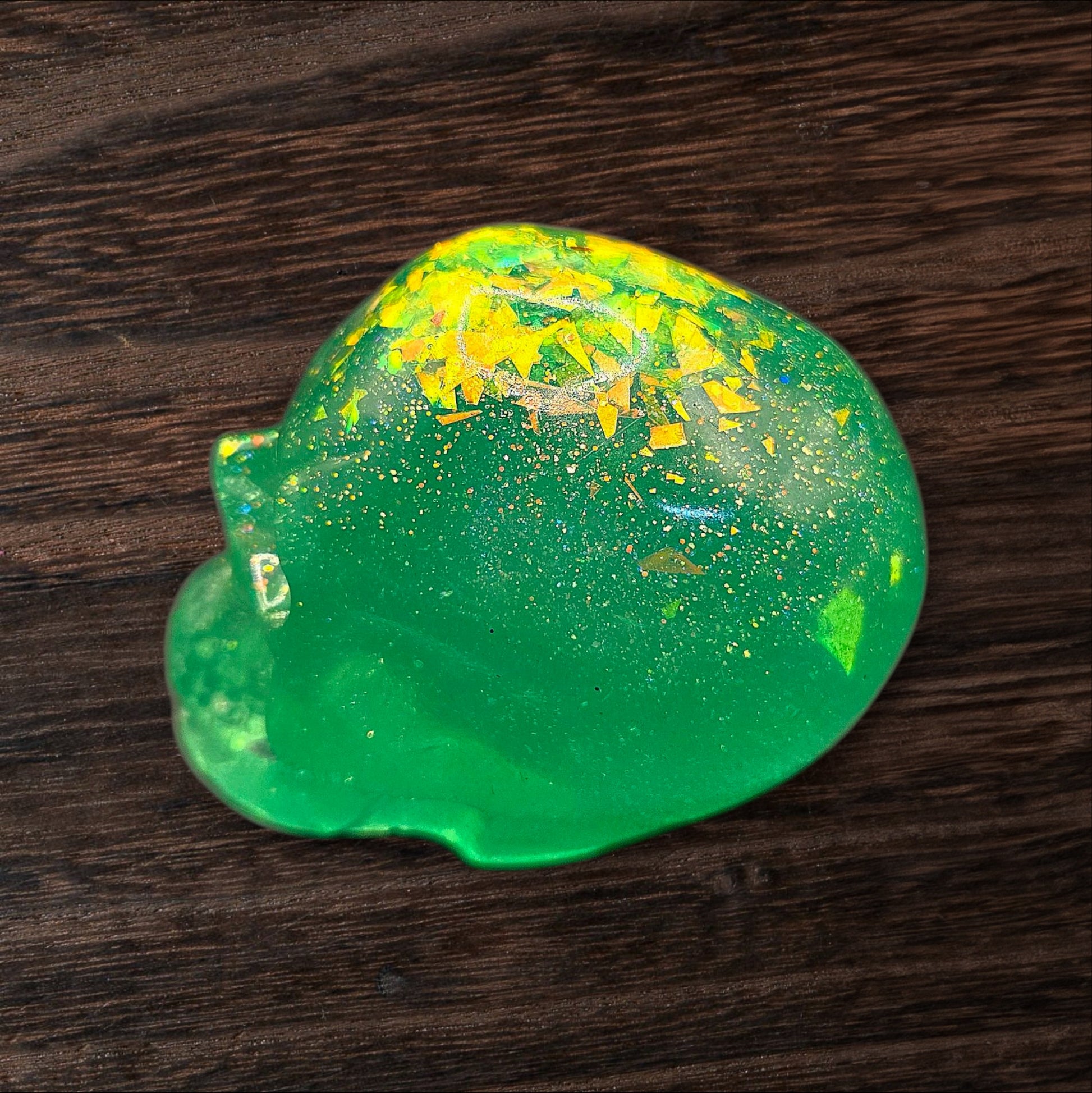 Add a touch of eerie elegance to your space with this handmade emerald green resin skull. Bursting with personality, this vibrant piece features a rich, translucent emerald base and a dazzling crown of chunky green iridescent glitter flakes. The light catches beautifully on the skull’s curves and shimmer, making it a stunning addition to any altar, shelf, or spooky aesthetic setup. Perfect for Halloween, gothic décor lovers, or anyone who appreciates a little glitter with their macabre.