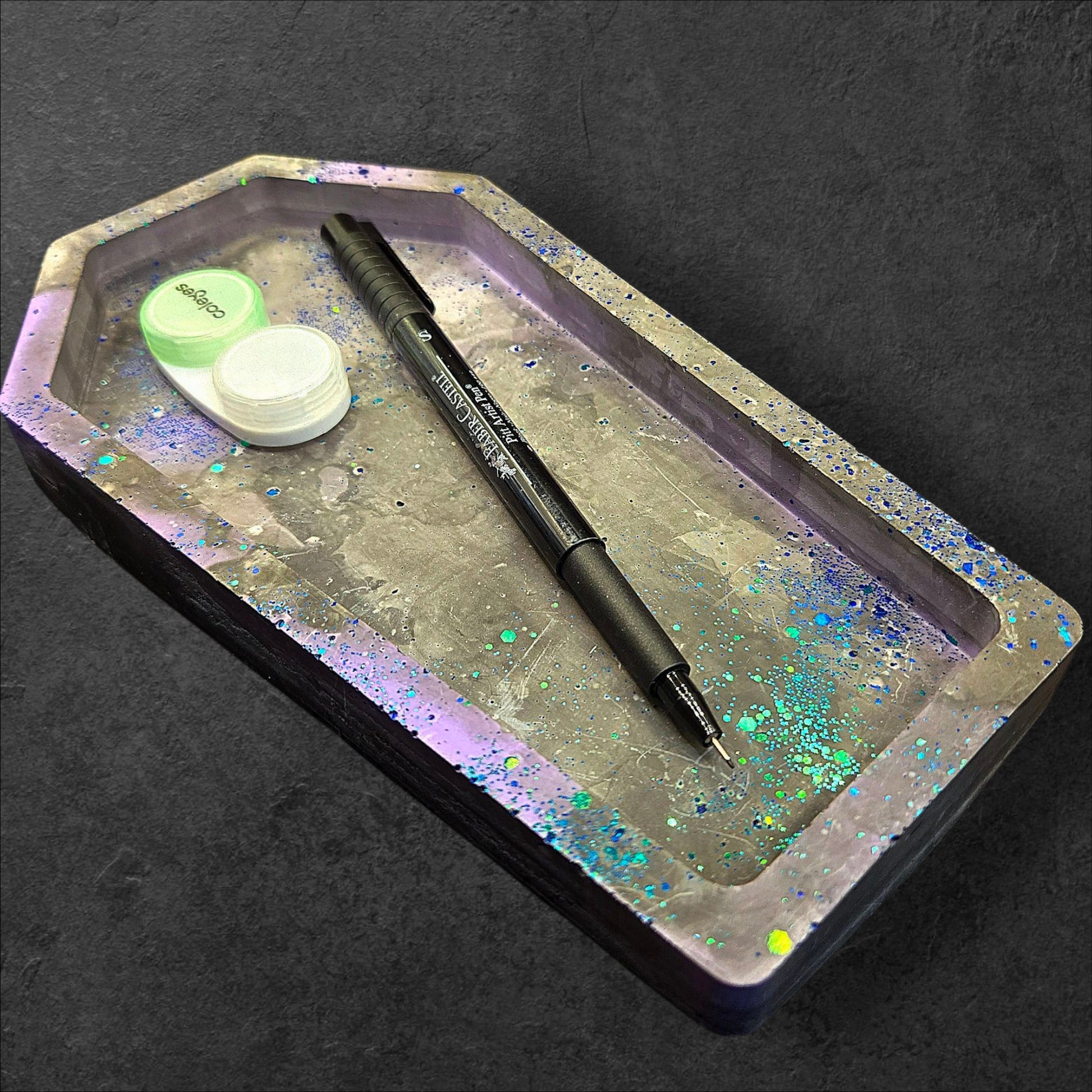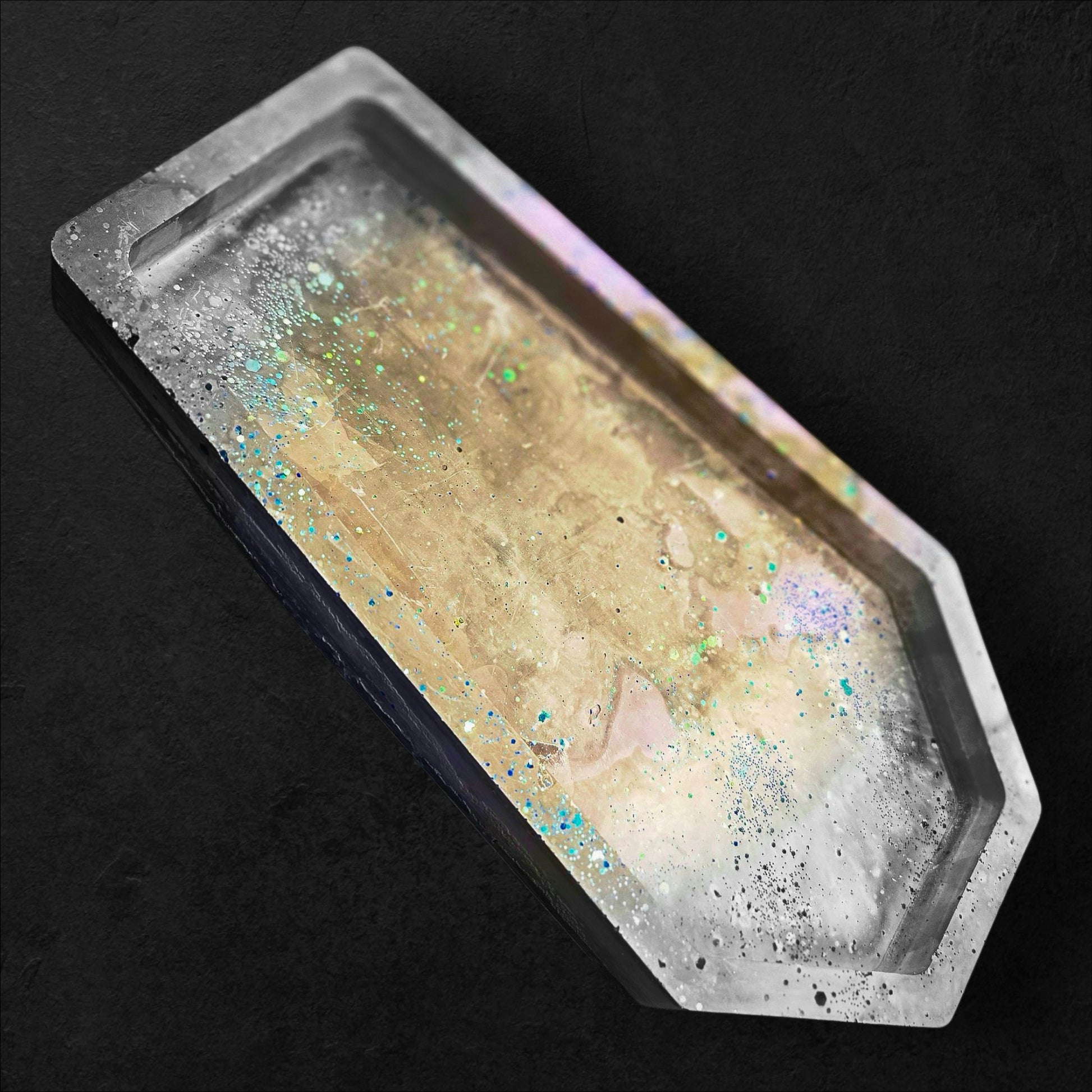 Step into the shadows with this striking coffin-shaped tray, masterfully crafted from rich, dark gray and purple concrete-like ceramic. Embedded within its sturdy form is a captivating, geode-inspired glitter display that glimmers mysteriously between blue and purple, catching the light in dazzling bursts of color. Pictures simply can't capture the hypnotic beauty of the glitter's depth and sparkle. Perfect as an edgy catch-all for your jewelry, crystals, or desk essentials, this tray effortlessly blends practical design with dark elegance, making it an enchanting centerpiece for any alternative décor.