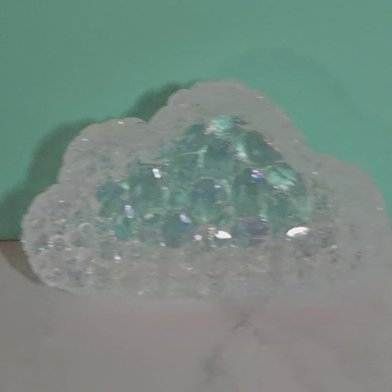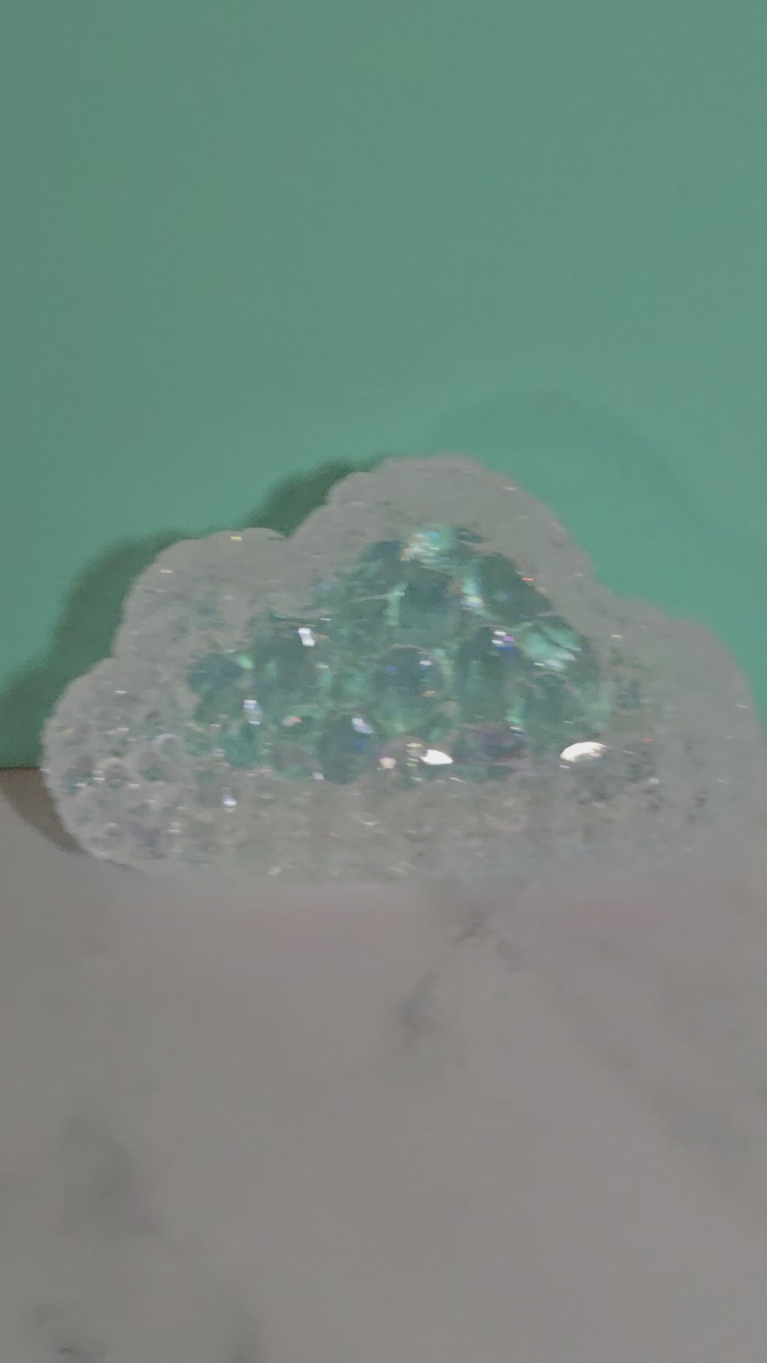 Capture a bit of sky magic with this dreamy mini crystal cloud dish. Made from sparkling clear resin and embedded with faceted crystal-like textures, this piece shimmers with an ethereal blue flash thanks to the aurora powder mixed into the resin. Whether it's holding your favorite rings, tiny trinkets, or just catching the light on a shelf, this cloud adds a touch of fantasy to any space.