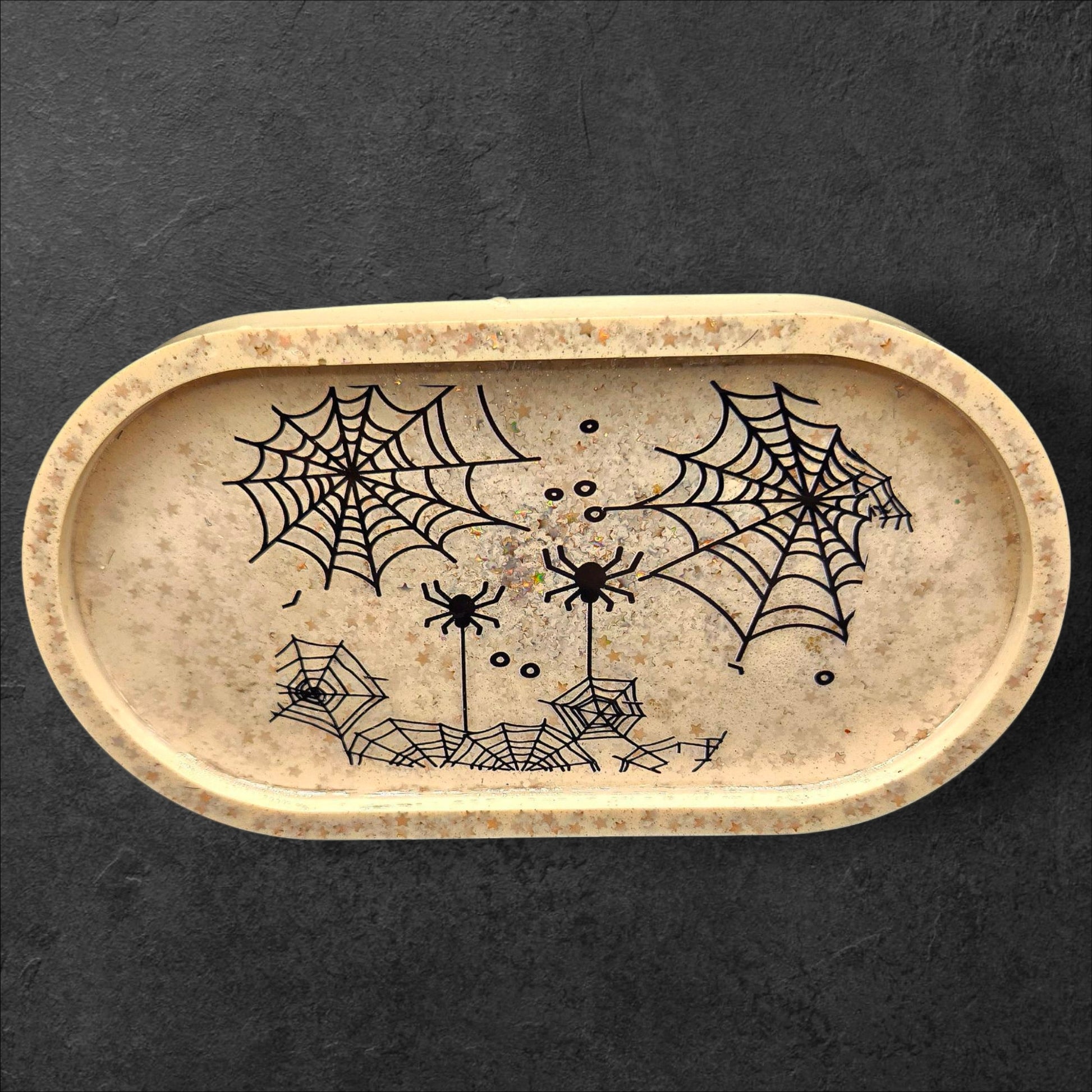 This spooky-cute tray is serving cozy Halloween vibes! Made from chunky cream-colored resin, it's packed with shimmering gold stars and topped with a bold spiderweb and spider design. Perfect for holding your jewelry, crystals, keys, or spooky trinkets, this tray adds a fun gothic flair to any space. A little witchy, a little whimsical, and a whole lot of charm!