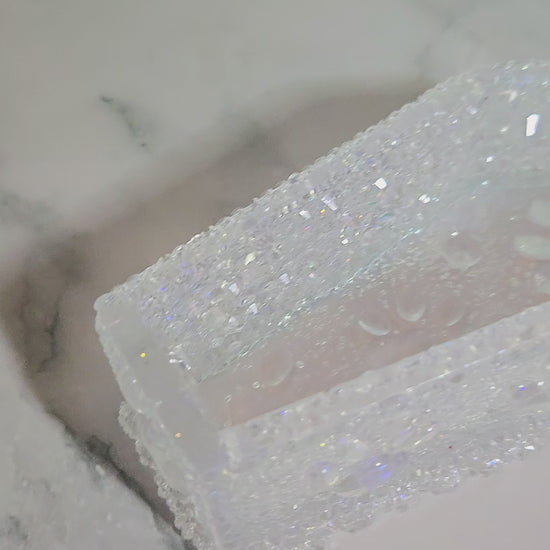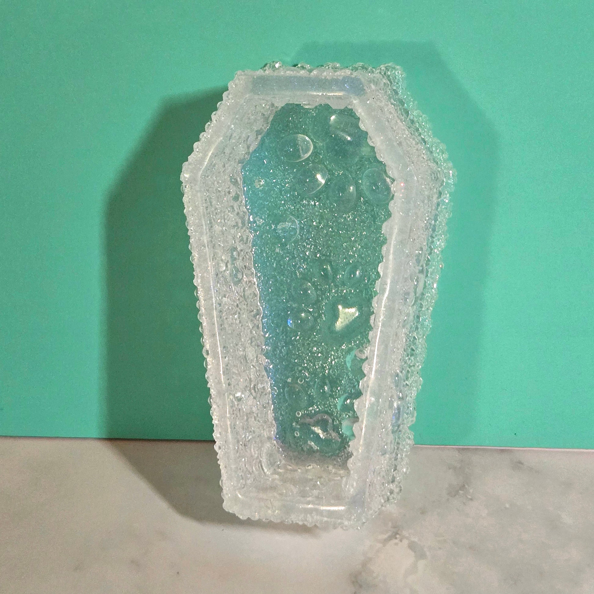 A little creepy, a little enchanting—this crystal coffin trinket tray is the perfect blend of spooky and celestial. Made with shimmering aurora powder, it catches the light with an icy blue flash that dances across its surface. Embedded with subtle “zombie paw” impressions and glimmering crystal textures, it feels like a relic from a haunted fairytale.